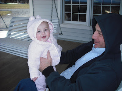 Saturday was beautiful and warm so we had Calynn outside for some fresh air to try to clear up her cold. Jeff did some yard work while we kept it low key. Calynn had fun practicing her sitting and looking up on her Dad. (This beautiful play blanket was handmade by my friend Beth.)